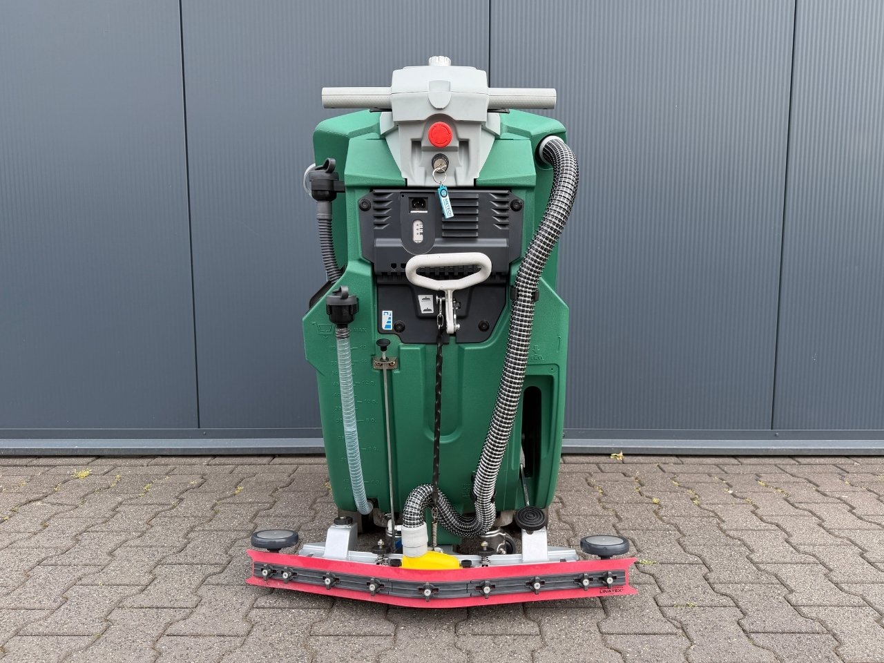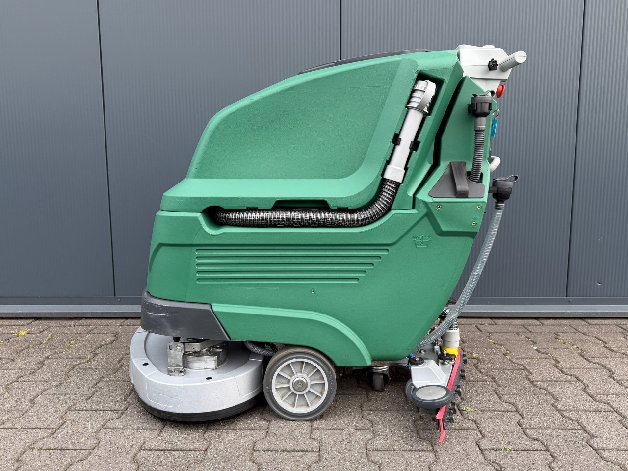 De machine werkt op een 24V-accu met een inzetduur tot ongeveer 3 uur. Door het lage geluidsniveau (<65 dB(A) is hij perfect inzetbaar tijdens openingstijden. Licht, compact en eenvoudig te bedienen – precies wat je nodig hebt voor dagelijks onderhoud.