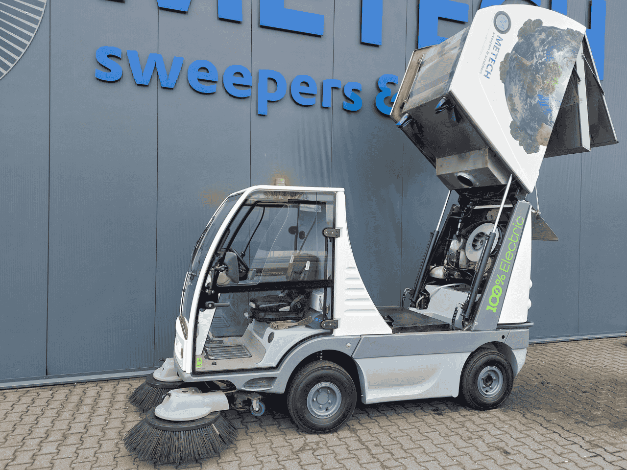Met een veegbreedte van 227 cm en een capaciteit van 28.000 m² per uur veegt de Evos moeiteloos grote oppervlakken schoon. De 2.000 liter vuilbak met hooglosfunctie en 400 liter watertank zorgen voor lange werkcycli. De elektrische AC-motoren leveren sterke zuiging en nauwkeurige reiniging langs randen en obstakels.